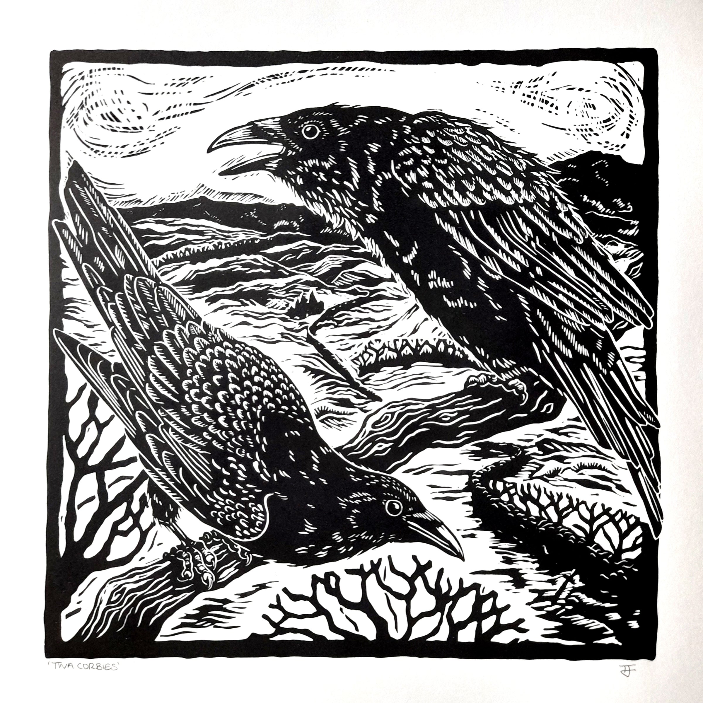 Original handprinted linocut of two ravens, inspired by the Scottish folk song 'The Twa Corbies'. Titled and signed by the artist. Open edition.