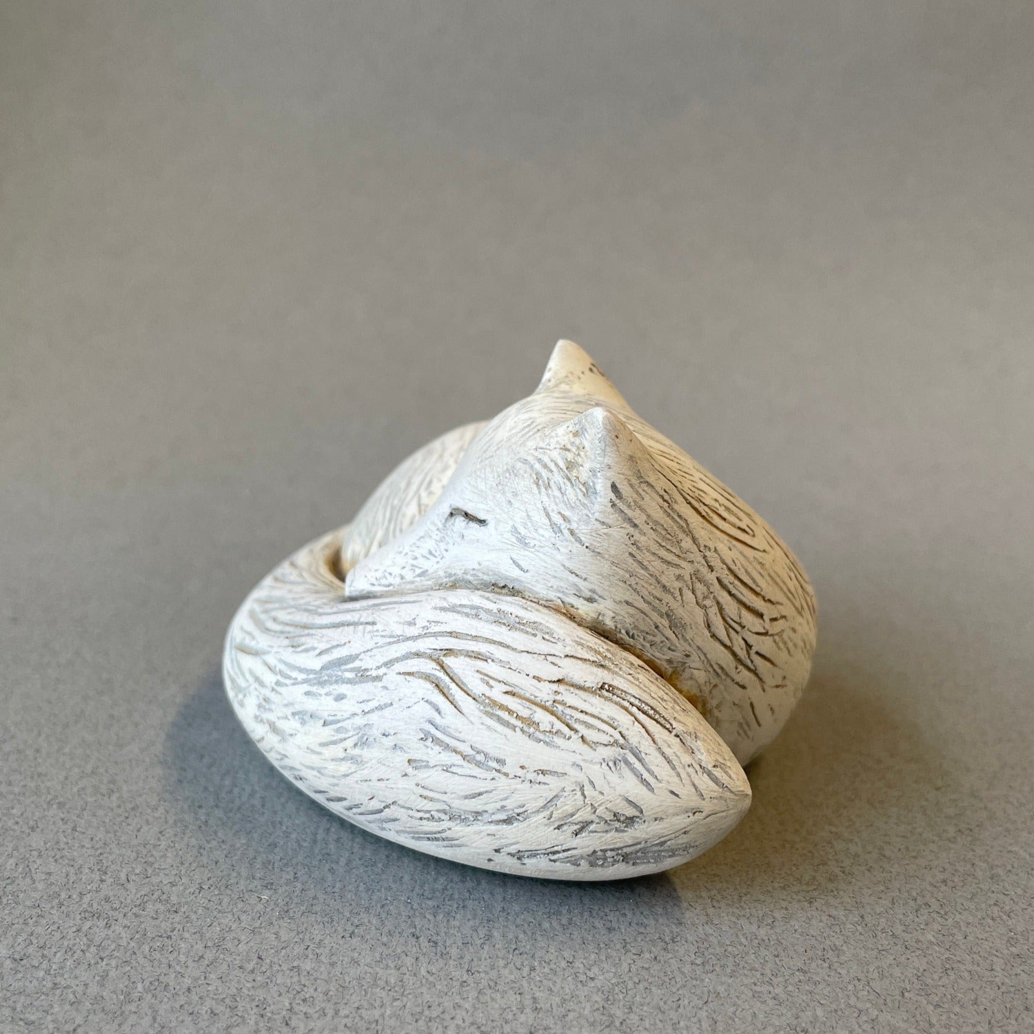 This is an endearing marble resin sculpture of an Artic fox curled up sleeping.