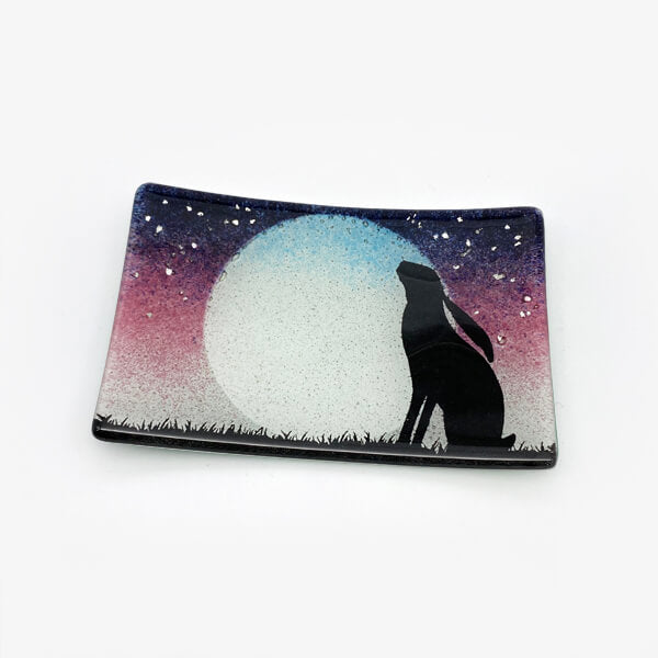 A glorious hare, symbolic of new beginnings is captured in this beautiful soap dish. This gorgeous glass dish is the perfect place to rest your bar of soap or jewellery. Hand printed and fired to perfection. Sure to put a smile on your face, or make a gorgeous gift for someone special.