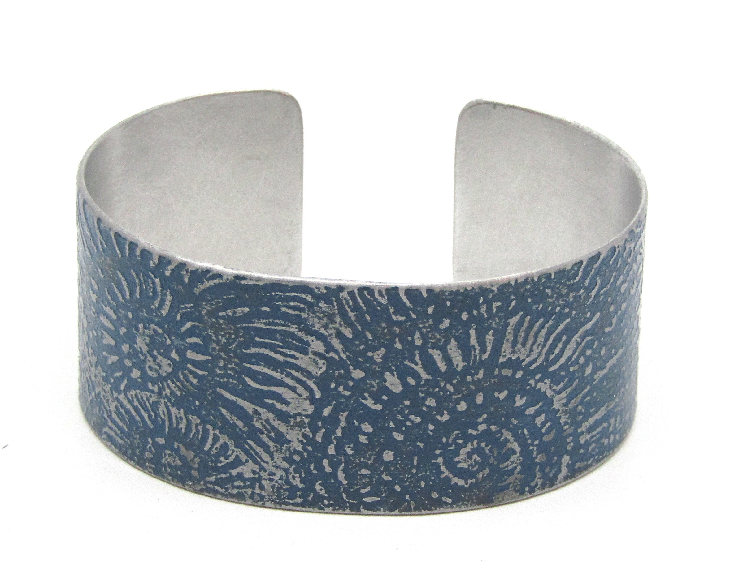 Beautiful blue aluminium cuff - hand etched by Anna Roebuck.