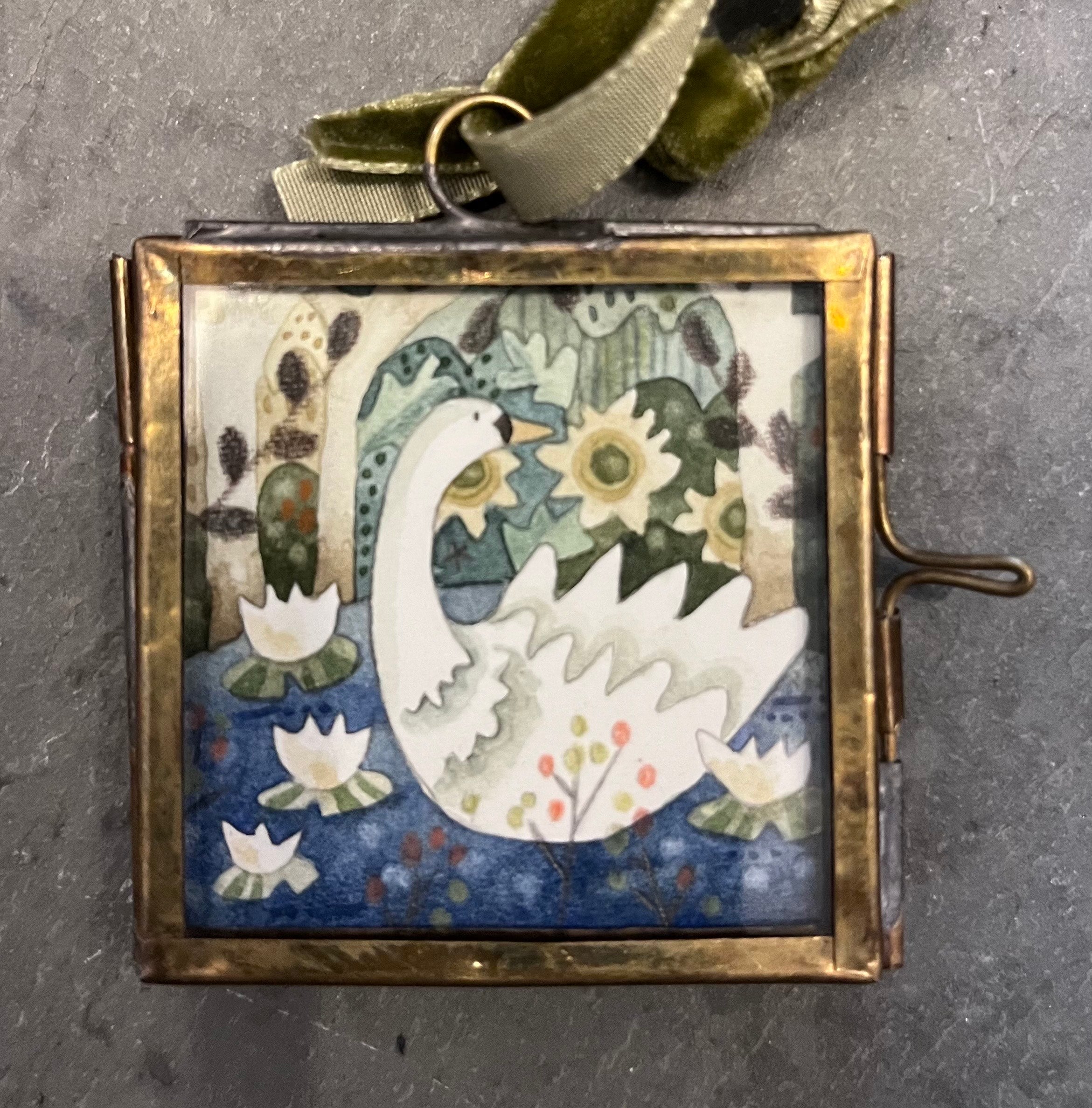 This gorgeous little piece is painted in a mix of watercolour, gouache and pencil. Supplied in a metal hinged frame and ribbon to hang it from, and in a prsentation gift box.