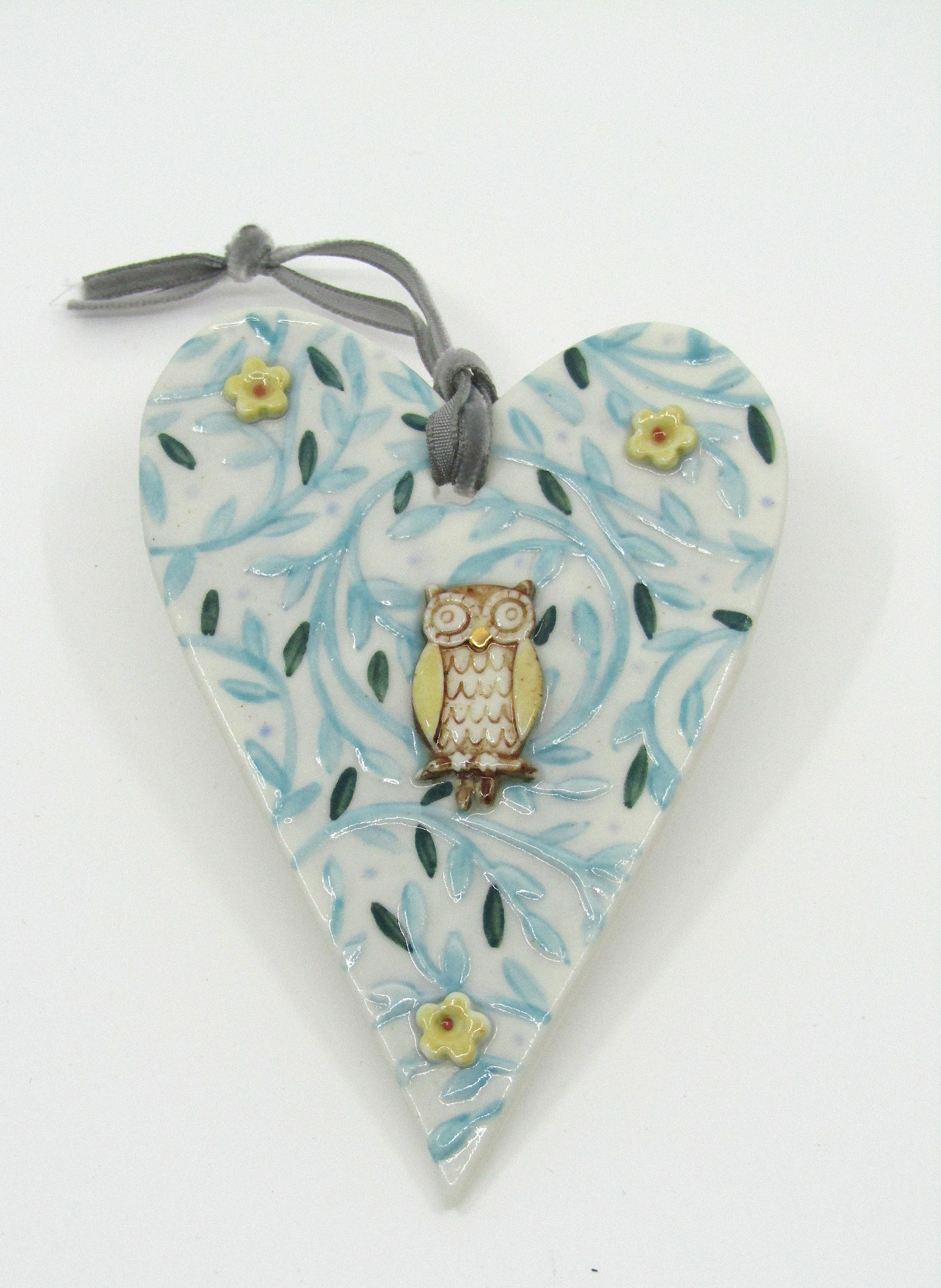 Beautiful, hand-crafted ceramic hanging heart by Katie Almond. The heart has a flower and owl design.