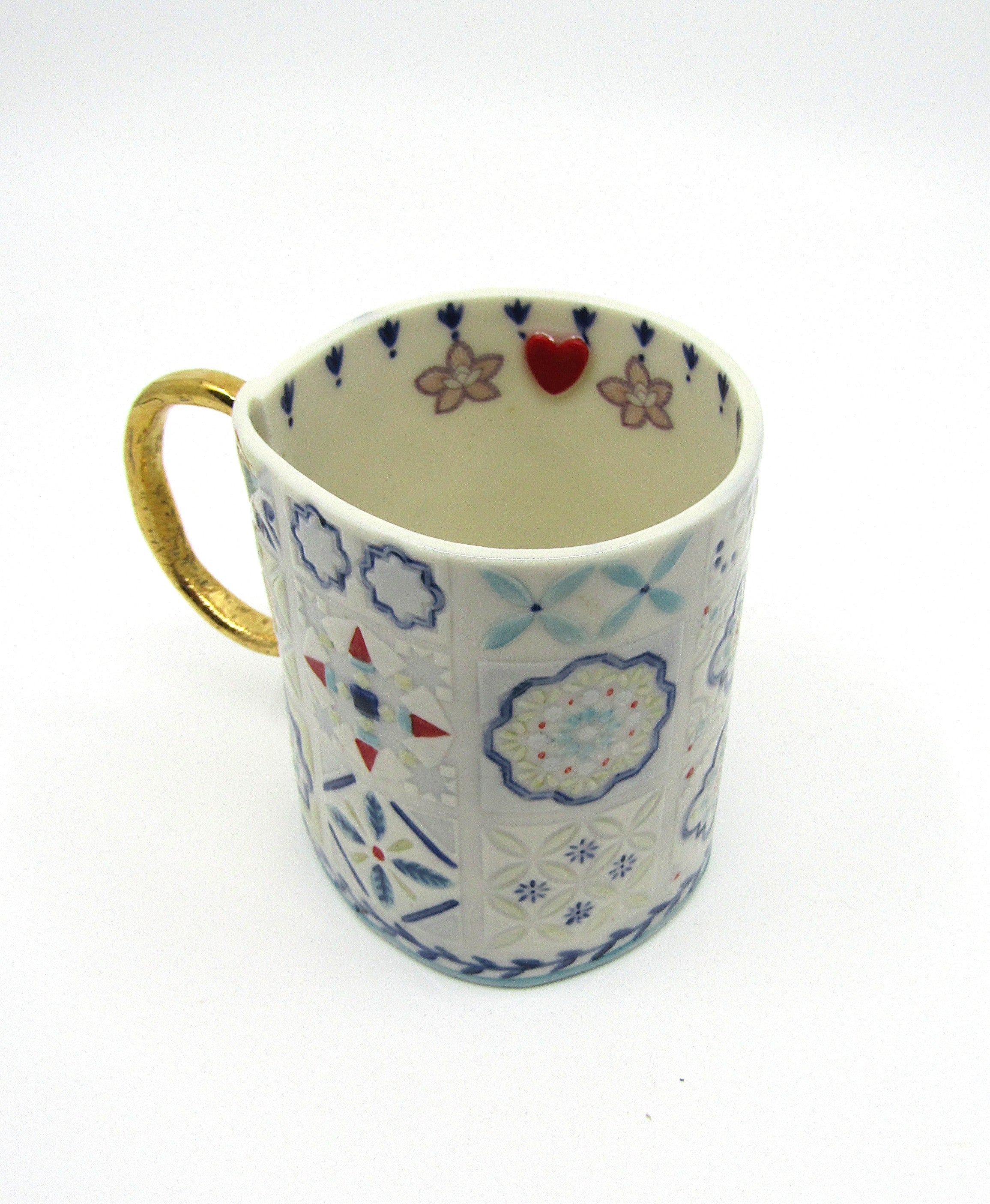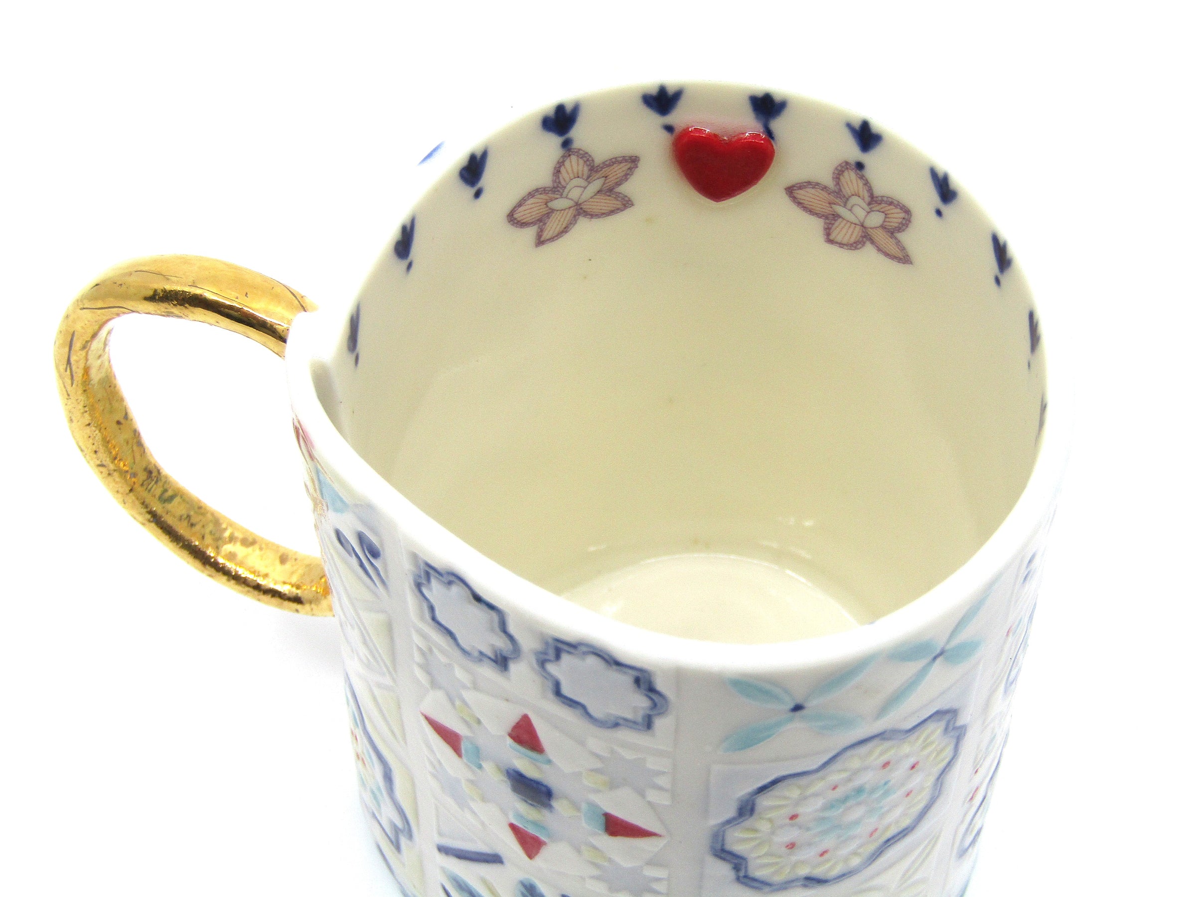 Beautiful, quirky hand-crafted ceramic mug by Katie Almond. The mug has a small heart & flower design on the inside of the mug.