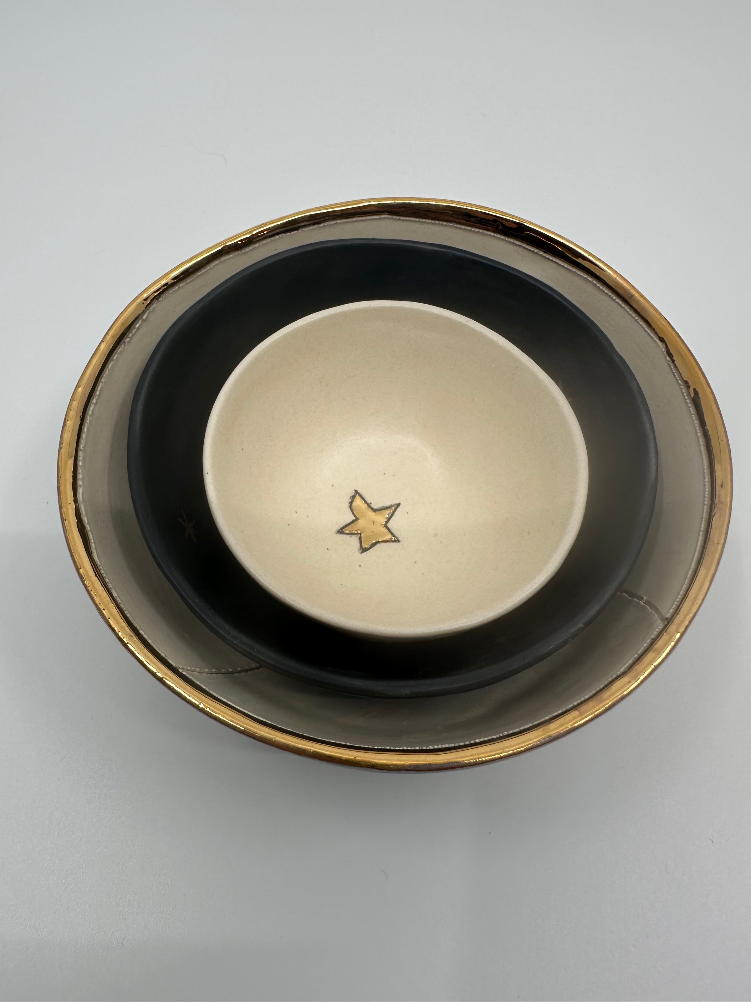 The bowls are handmade from stoneware clay, hand glazed and finished with real gold.