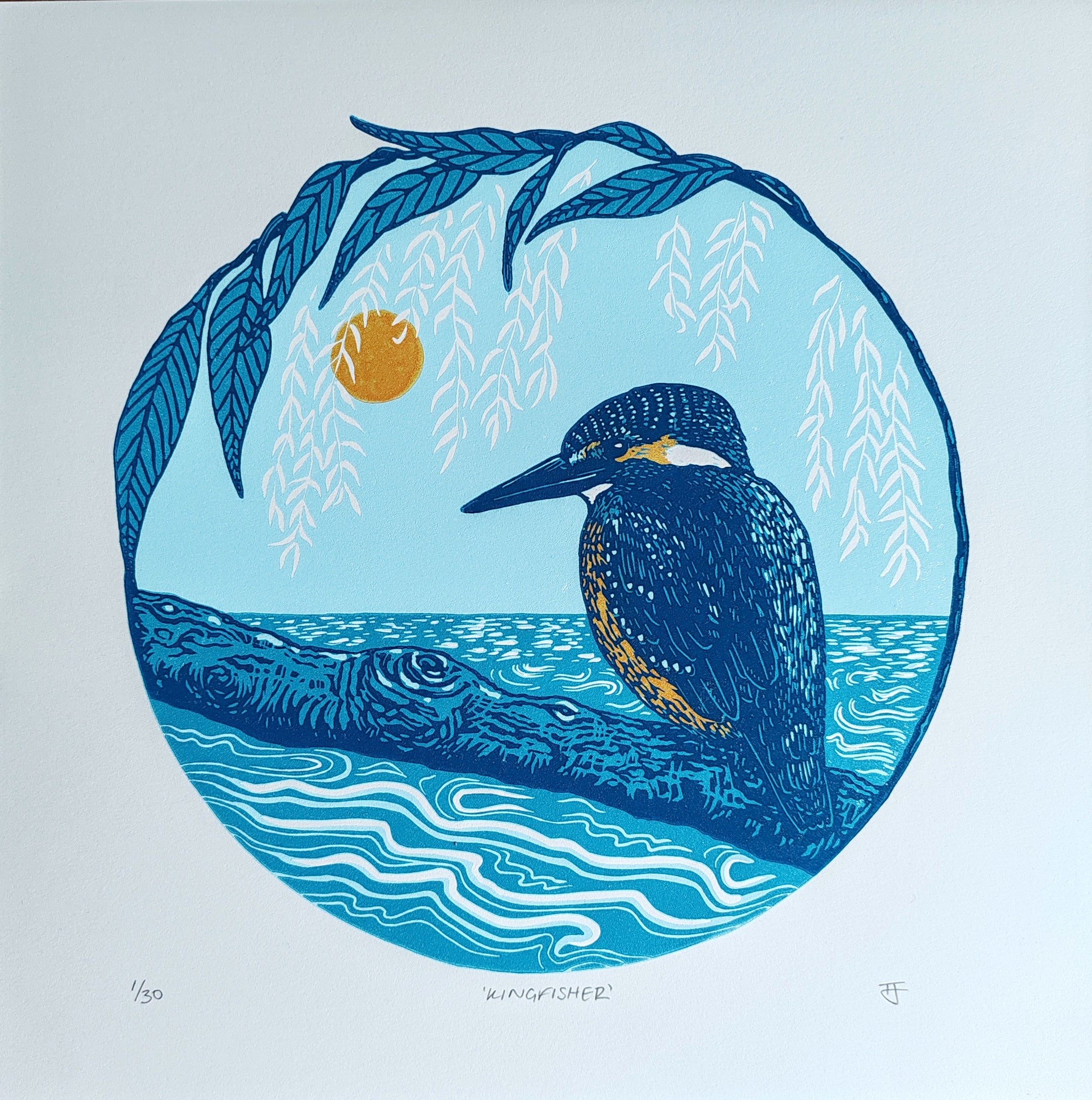 Original 4-colour reduction linocut of a kingfisher on a perch beneath a weeping willow tree. This is a limited edition of just 30 prints. Numbered, titled and signed by the artist.